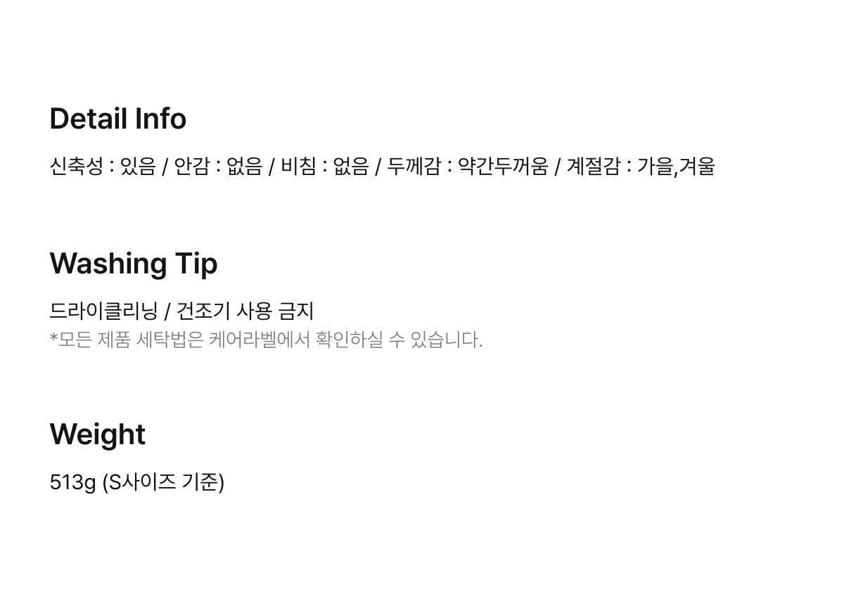 · 모든 의류의 첫 세탁은 드라이크리닝을 추천하며, 세탁 후 착용 부탁 드립니다.