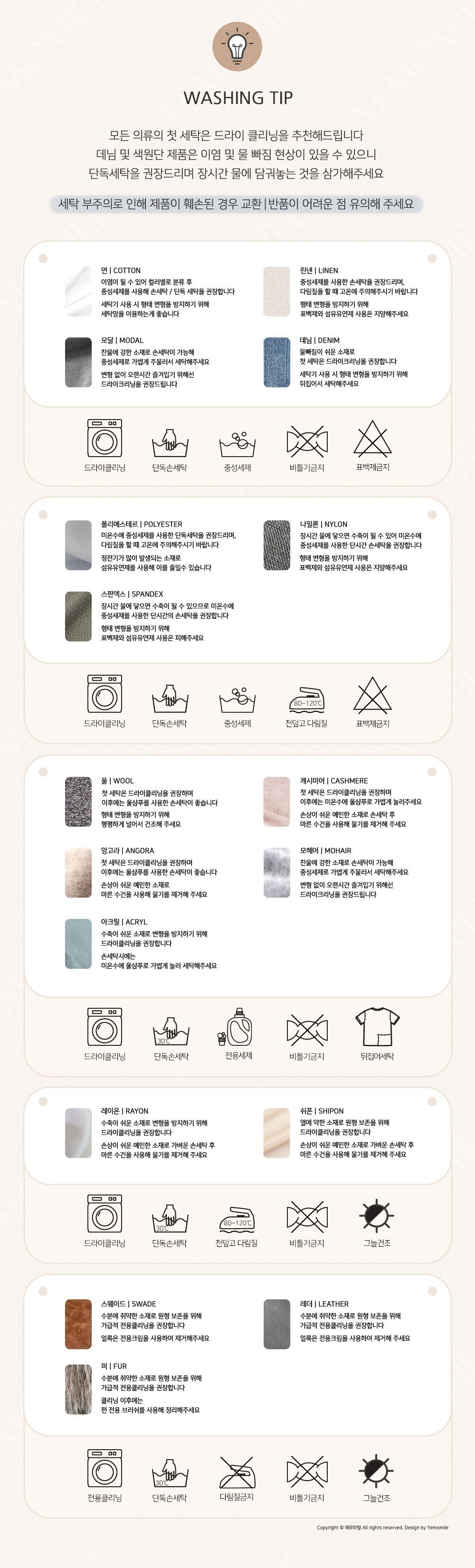 · 데님 및 컬러 제품은 이염 방지를 위해 단독 세탁을 권장합니다.