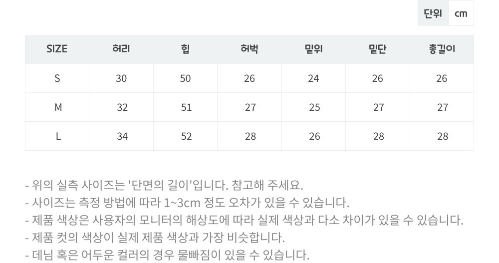| 사이즈 | 허리 | 힙 | 밑위 | 허벅지 | 총길이 |