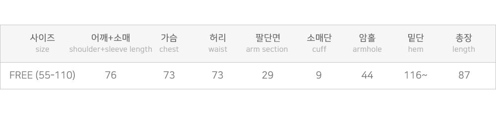 | 사이즈 | 가슴 | 허리 | 암홀 | 팔폭 | 총길이 |