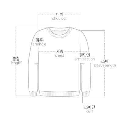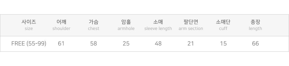 | 사이즈 | 어깨너비 | 가슴 | 암홀 | 팔길이 | 팔폭 | 총길이 |