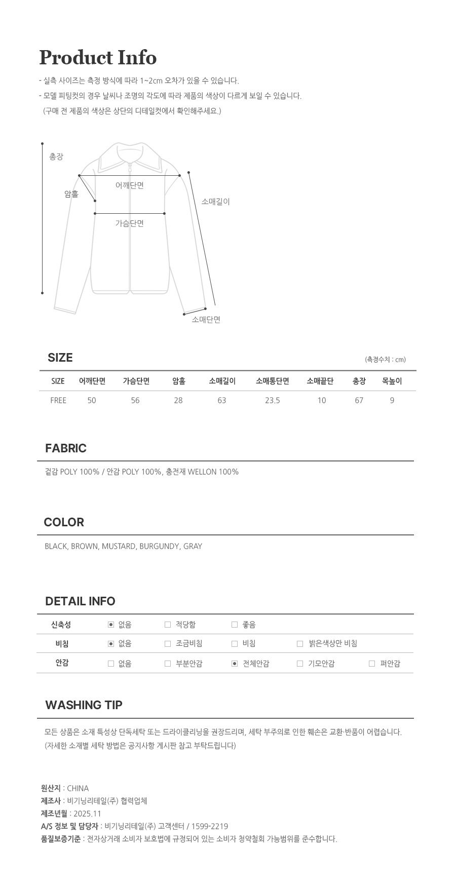 · 모든 의류의 첫 세탁은 드라이크리닝을 추천하며, 세탁 후 착용 부탁 드립니다.