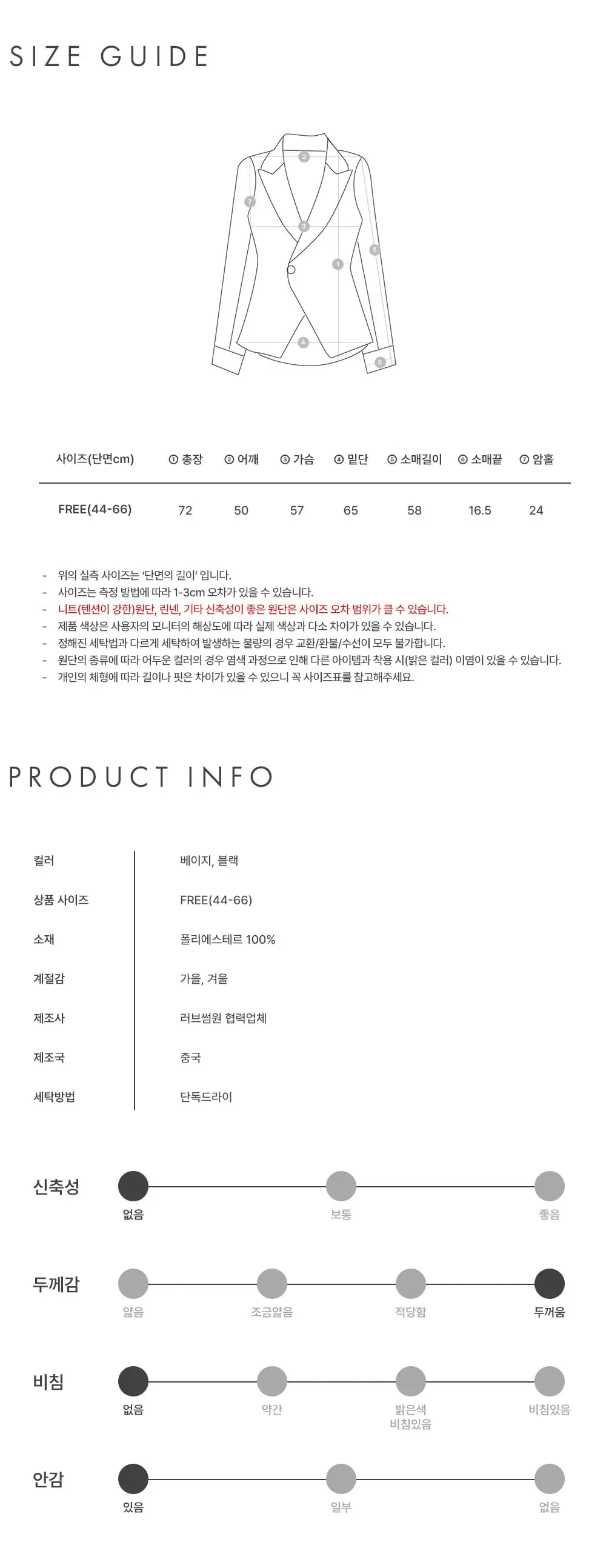 · 모든 의류의 첫 세탁은 드라이크리닝을 추천하며, 세탁 후 착용 부탁 드립니다.
