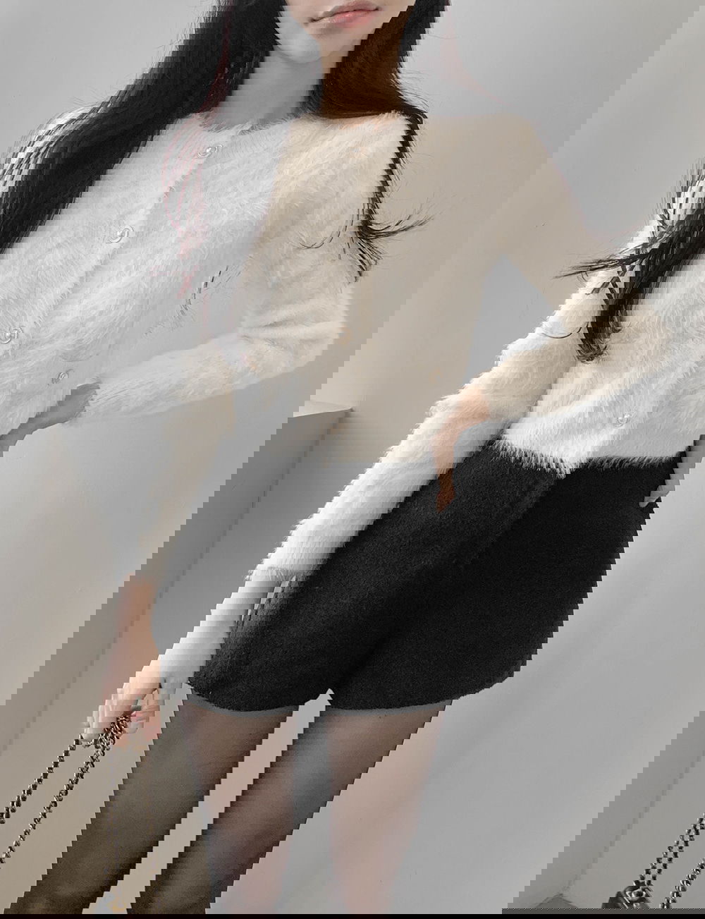 부드러운 에코퍼 소재와 고급스러운 디테일이 돋보이는 스퀘어 에코퍼 진주 가디건입니다.