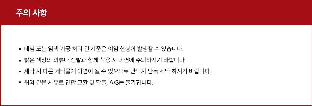 · 데님 및 컬러 제품은 이염 방지를 위해 단독 세탁을 권장합니다.