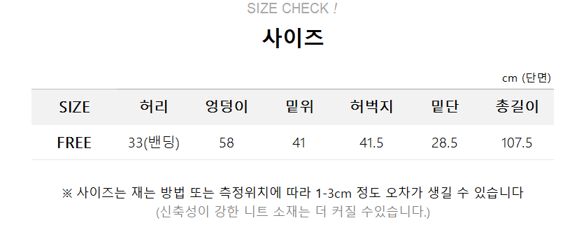 | 사이즈 | 허리 | 힙 | 밑위 | 허벅지 | 밑단 | 총길이 |
