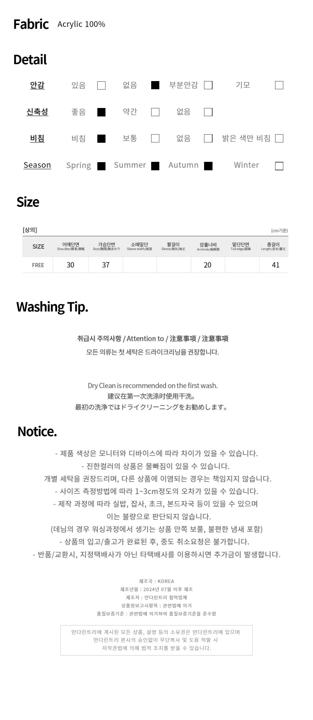 · 모든 의류의 첫 세탁은 드라이크리닝을 추천하며, 세탁 후 착용 부탁 드립니다.