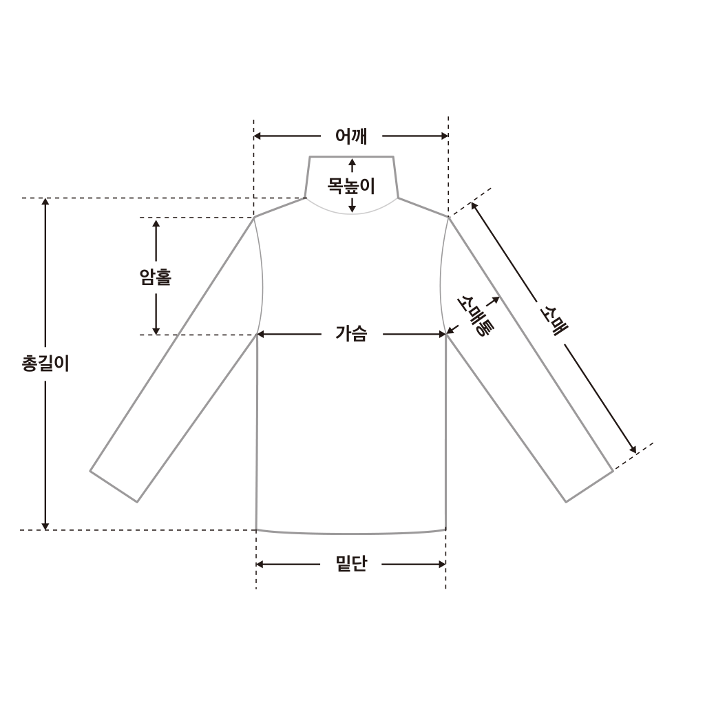 | 사이즈 | 어깨너비 | 가슴 | 암홀 | 팔길이 | 팔폭 | 총길이 |