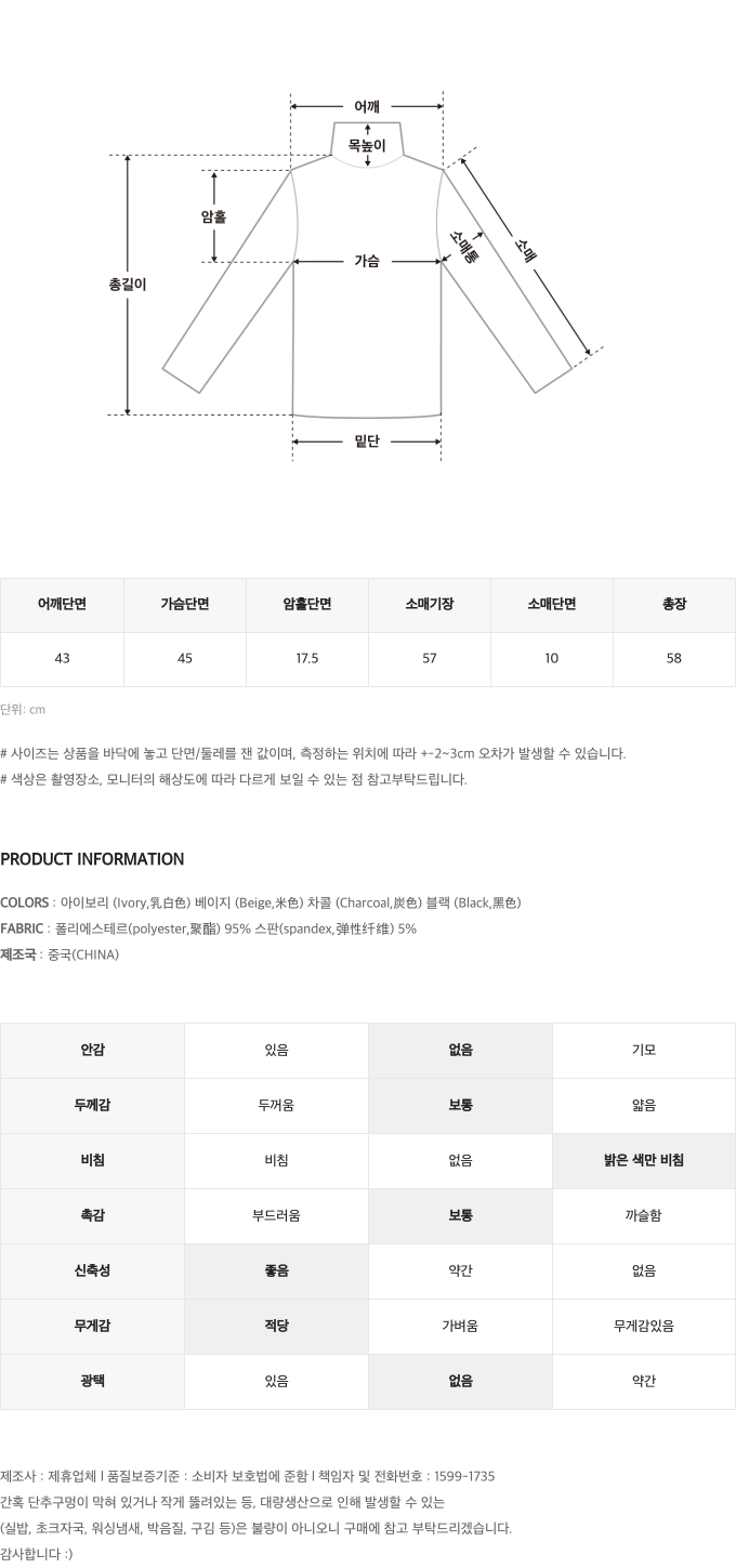 • COLORS : 아이보리 (Ivory,乳白色) 베이지 (Beige,米色) 차콜 (Charcoal,炭色) 블랙 (Black,黑色)
