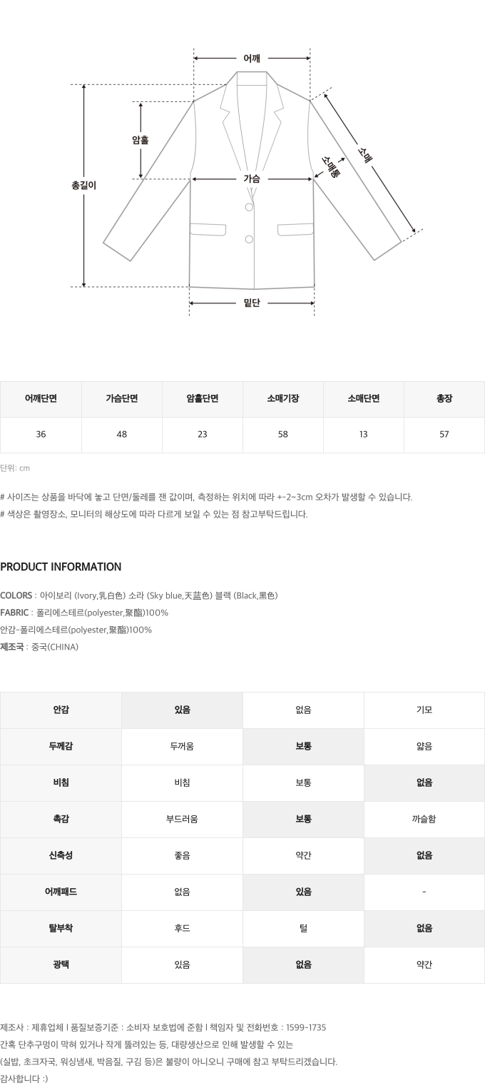 • FABRIC : 폴리에스테르(polyester,聚酯)100%