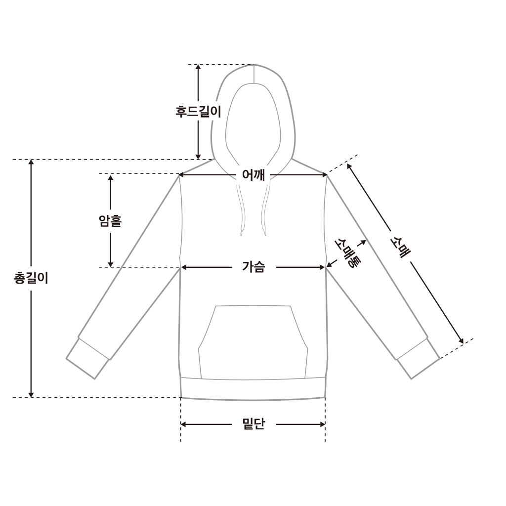 후드의 끈으로 원하는 핏에 맞춰 입을 수 있고