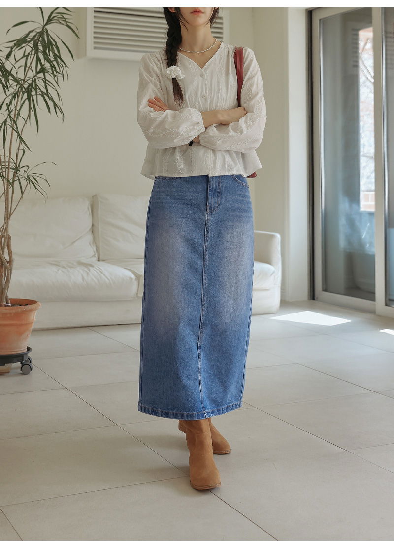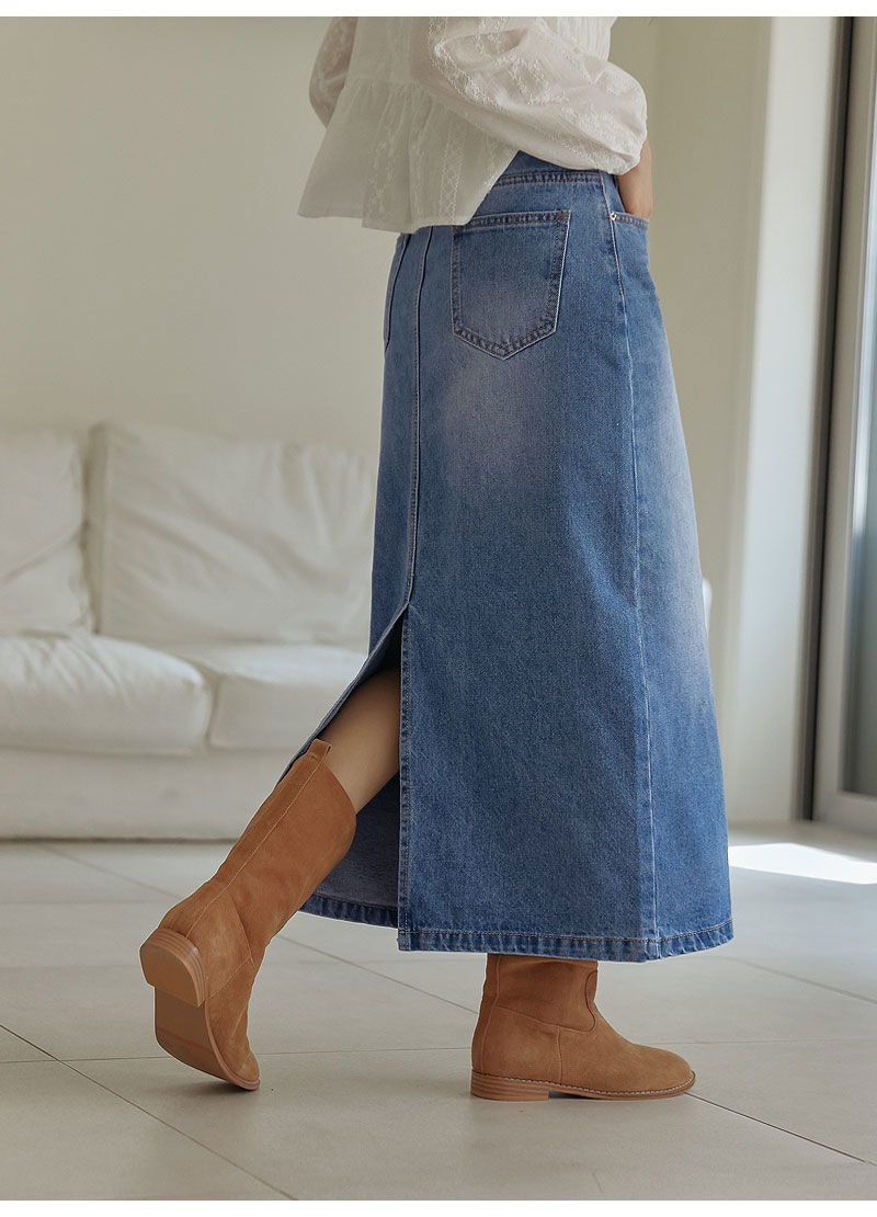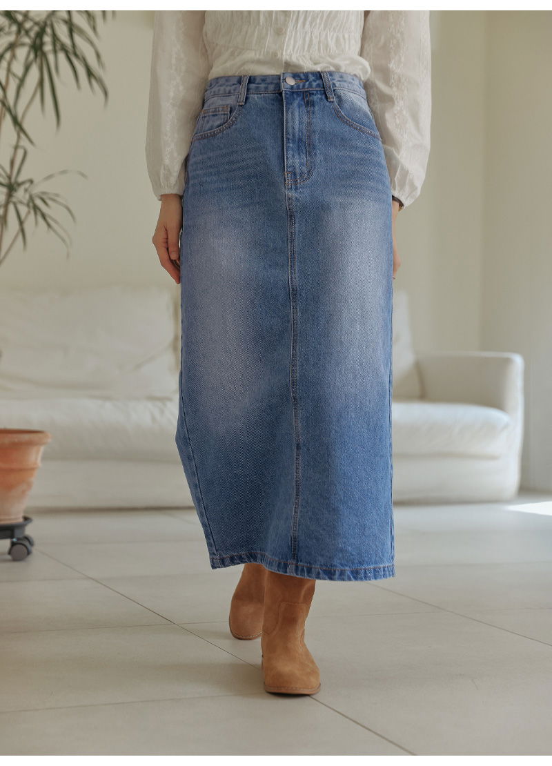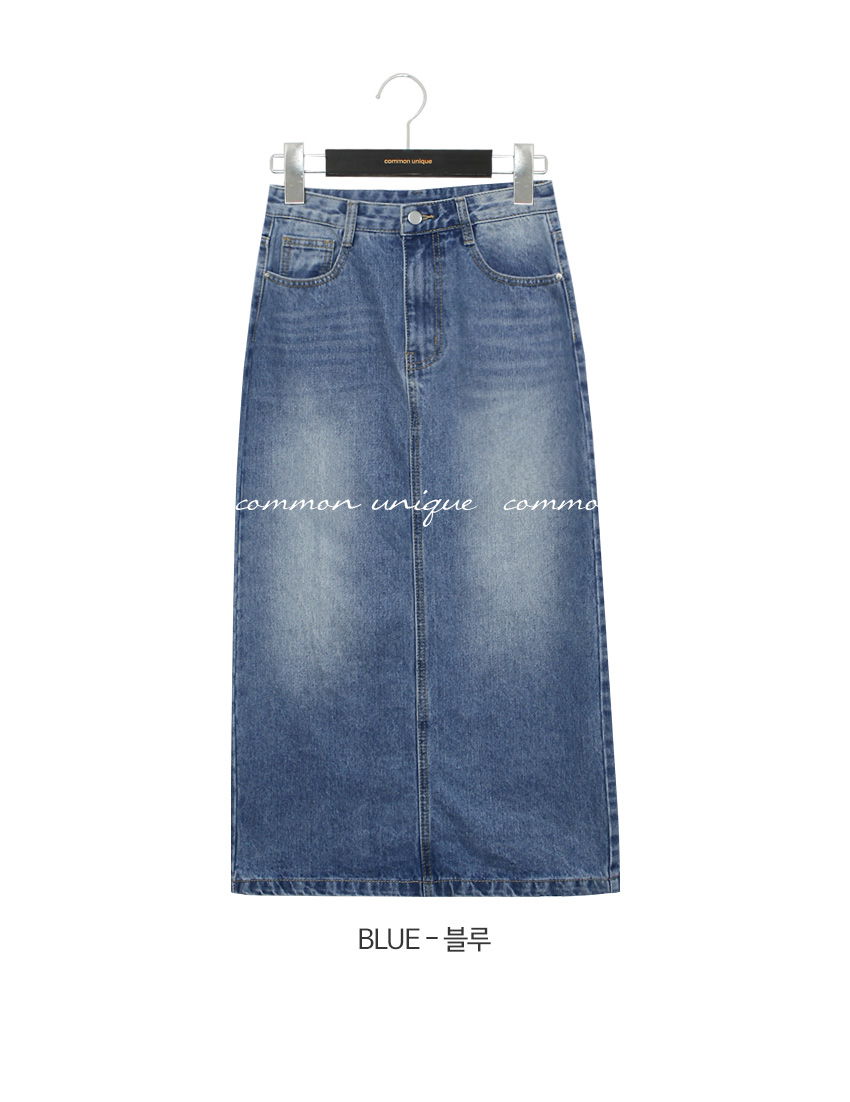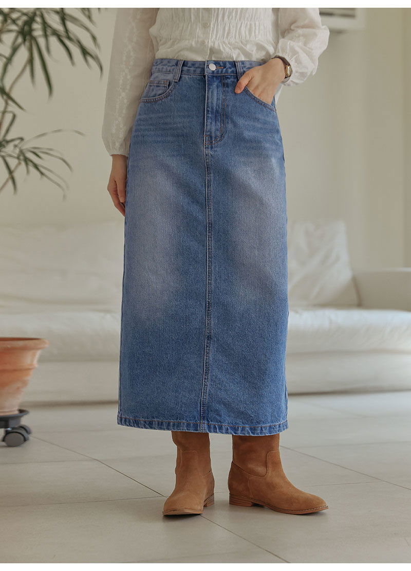 포벤토 워싱 데님 롱 스커트 (가을/간절기/사계절/맥시/백슬릿/청치마/코튼/베이직/캐주얼/개강룩/캠퍼스룩)