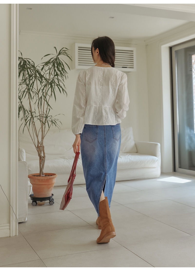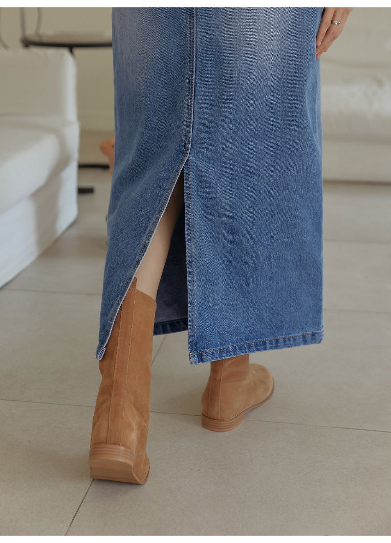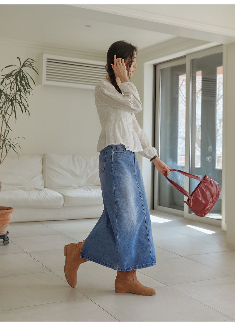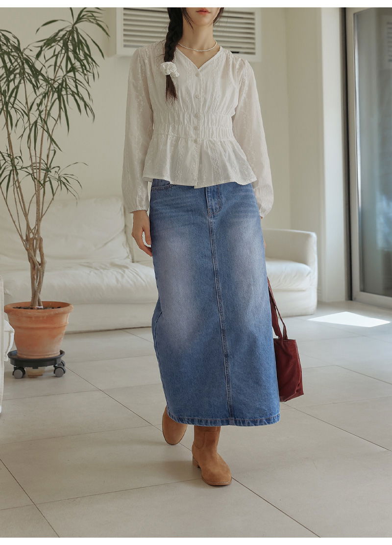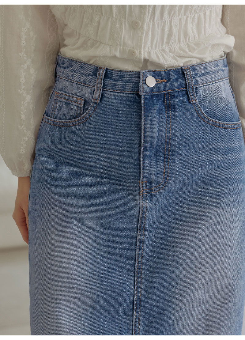 포벤토 워싱 데님 롱 스커트 (가을/간절기/사계절/맥시/백슬릿/청치마/코튼/베이직/캐주얼/개강룩/캠퍼스룩)