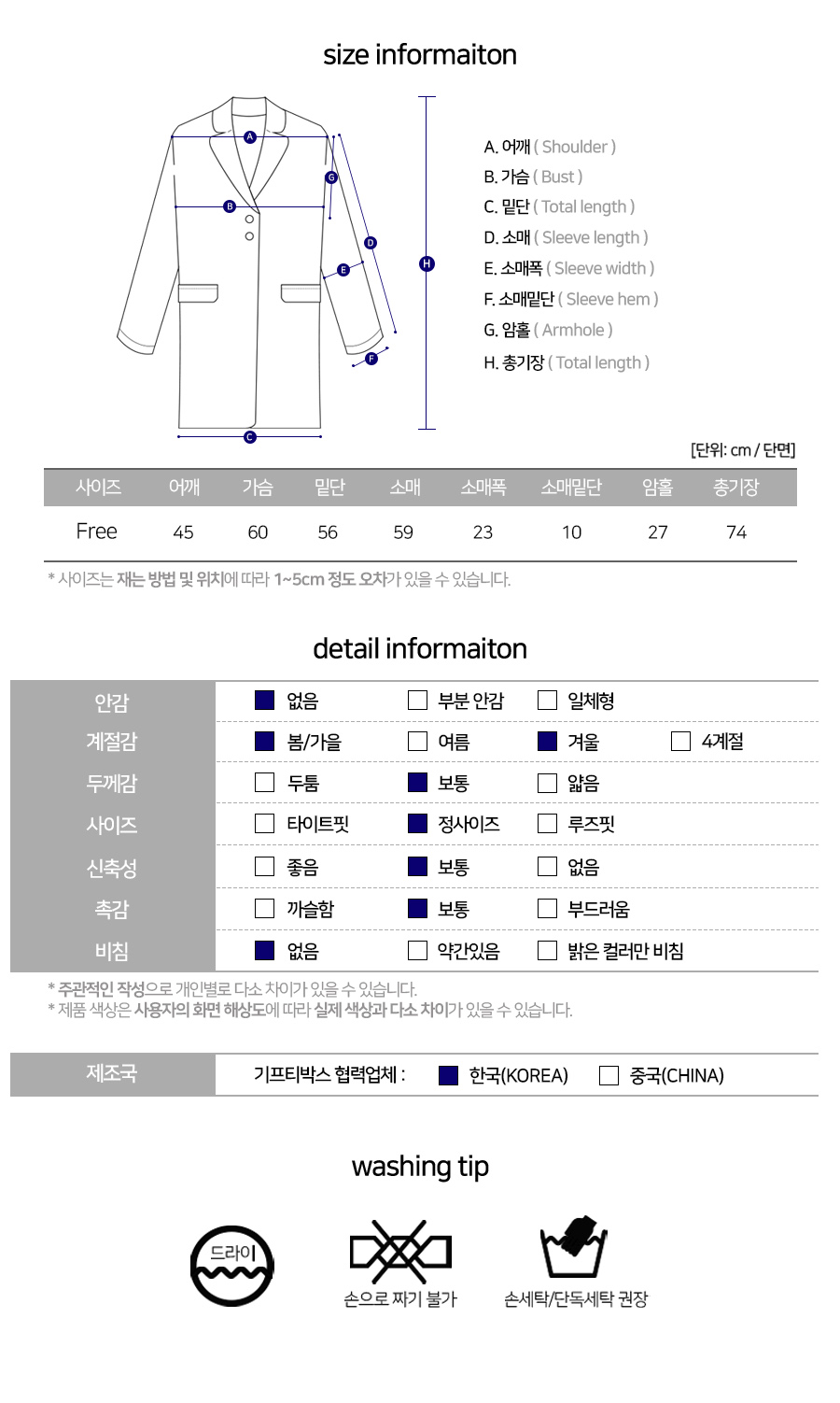 · 모든 의류의 첫 세탁은 드라이크리닝을 추천하며, 세탁 후 착용 부탁 드립니다.